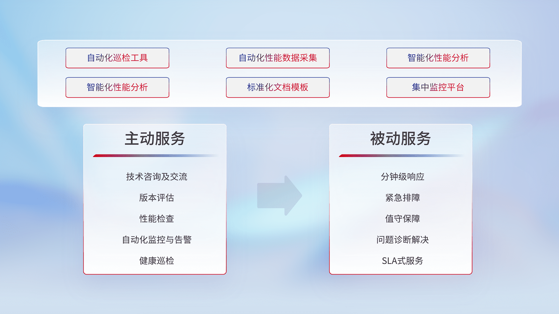 智能化工具和标准化文档,,保障服务质量,,,,提供主动服务(包含技术咨询、、、版本评估、、性能检查、、、、自动化监控与告警、、健康巡检)和被动服务包含(分钟级响应、、、紧急排障、、值守保障、、、、问题诊断解决、、、、SLA服务)。。。。